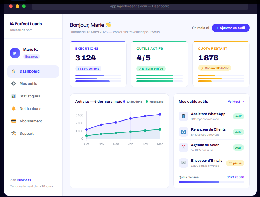 Nous installons des outils d’automatisation IA adaptés à votre activité: WhatsApp, emails, rendez-vous, facturation. Opérationnel en 48h, sans logiciel à installer.